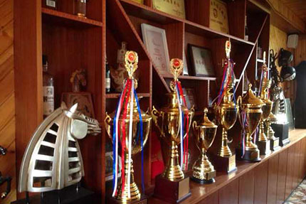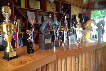 朋友的养马场、参加了囯内外知名的赛马比赛、这些年来获得无数的各种奖杯、摆满了VlP休闲区!光辉文化传播有限公司准备组织更多的好朋友大家一起来吧!!!