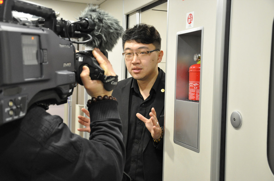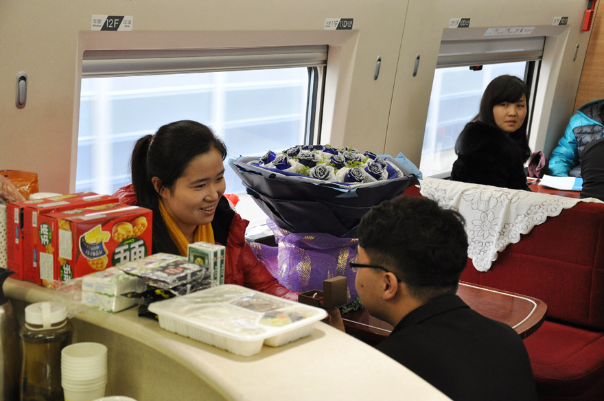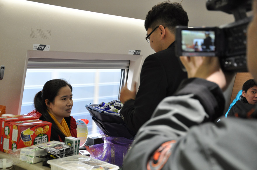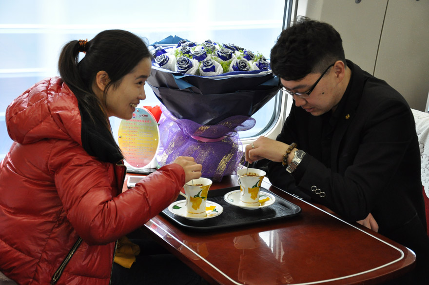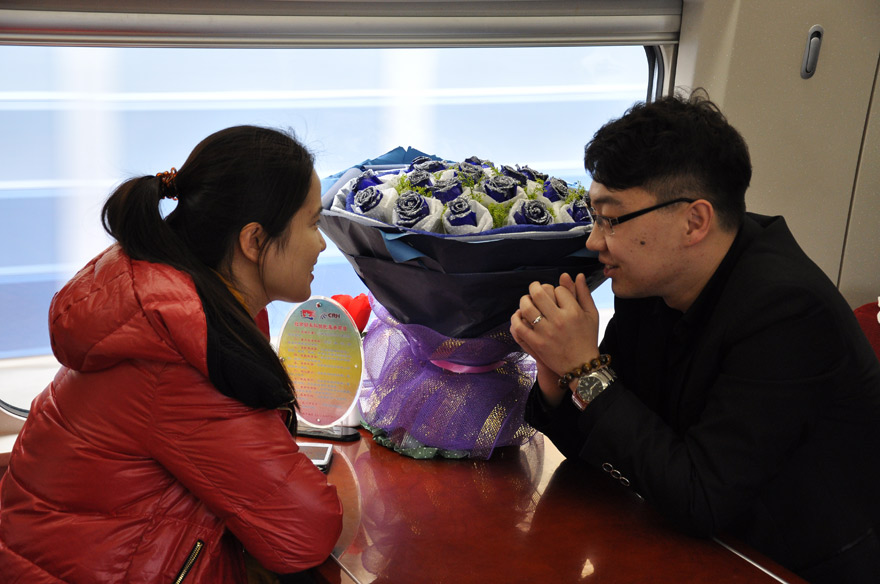 王光辉在高速行驶的动车上为一位帅哥策划拍摄了一场新颖前卫的求婚仪式。帅哥向女孩真诚地表白时,女孩瞬间被感动得热泪盈眶、惊喜万分,感人的场景引起了车厢内旅客们爆发出热烈的掌声。
